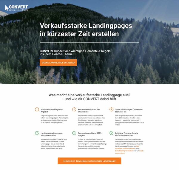 CONVERT ist ein Contao-Theme - ein vorgefertigtes Template für das CMS Contao, welches bereits alle wichtigen Conversion Elemente enthält.